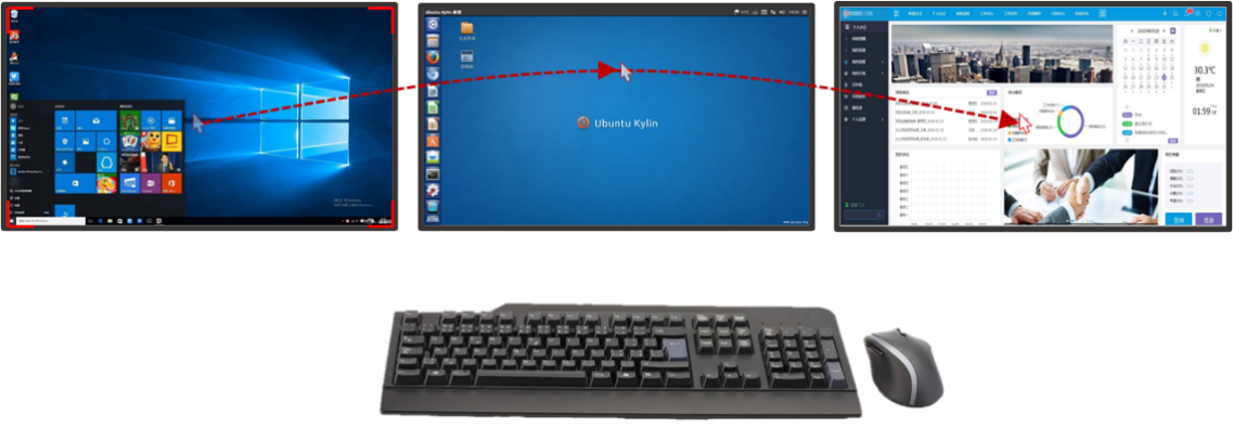 每个坐席均配置多台显示器,为了简化操作,分布式系统支持一套鼠标键盘操控多台主机:坐席端可以通过分布式软件对受控的屏幕按组划分,通过坐席端的显示器多行、多列的不同摆放形式进行对应匹配的设置;设置完成后,即可通过一套鼠标键盘管理、控制坐席端的全部屏幕,实现鼠标和键盘的跨屏、漫游。单个坐席可实现任意组合(任意行×任意列)的坐席端屏幕的跨屏漫游操作,坐席端可以轻松实现多屏幕显示操作的应用场景。