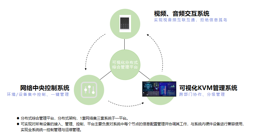 现代化建设指挥中心、大会议集群场所的声、光、电、视、讯等各子系统进行集中管理统一调度,智能化控制,多场景切换。