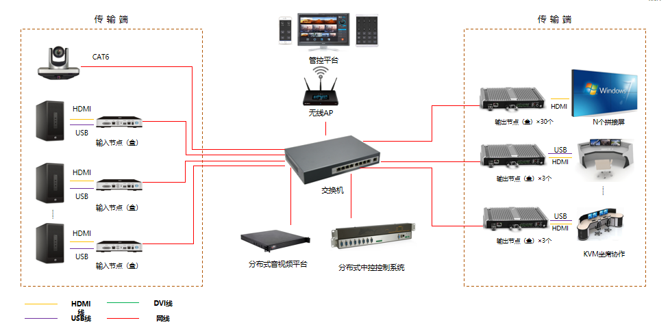 针对指挥中心涉及的各类业务画面信息采集与传输管理,配置分布式终端节点进行画面采集与传输,终端节点通过网络构建整个系统环境,避免了传统集中式设备布线繁琐的问题,同时,节点之间互不影响,单个节点出现故障不会影响整体系统传输。